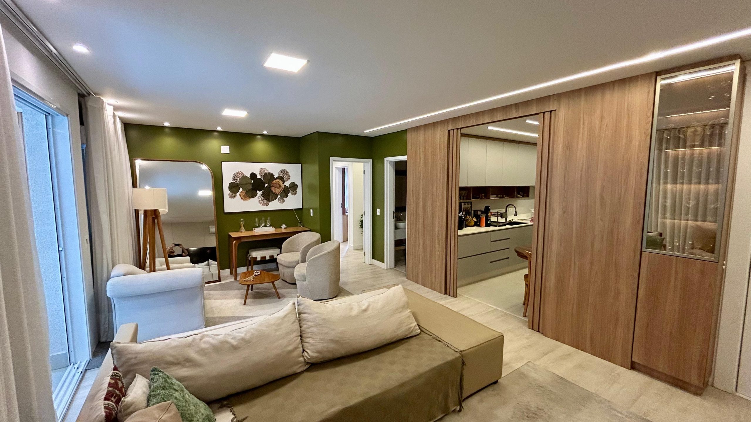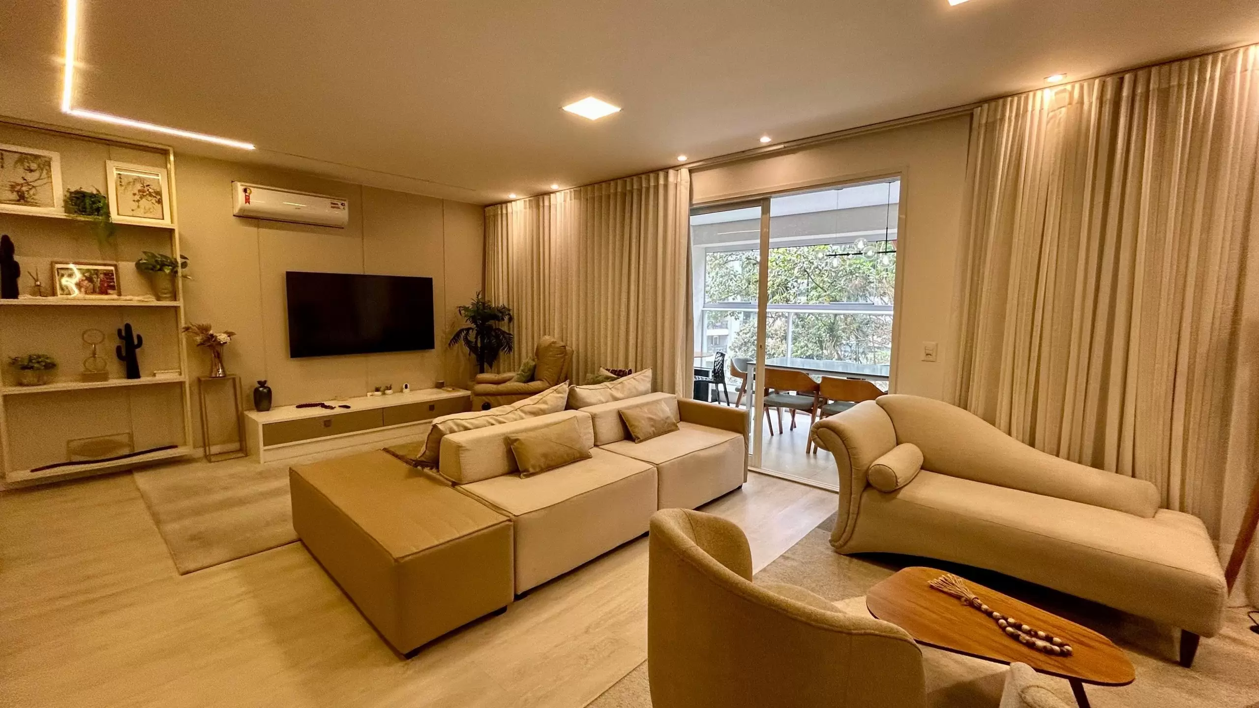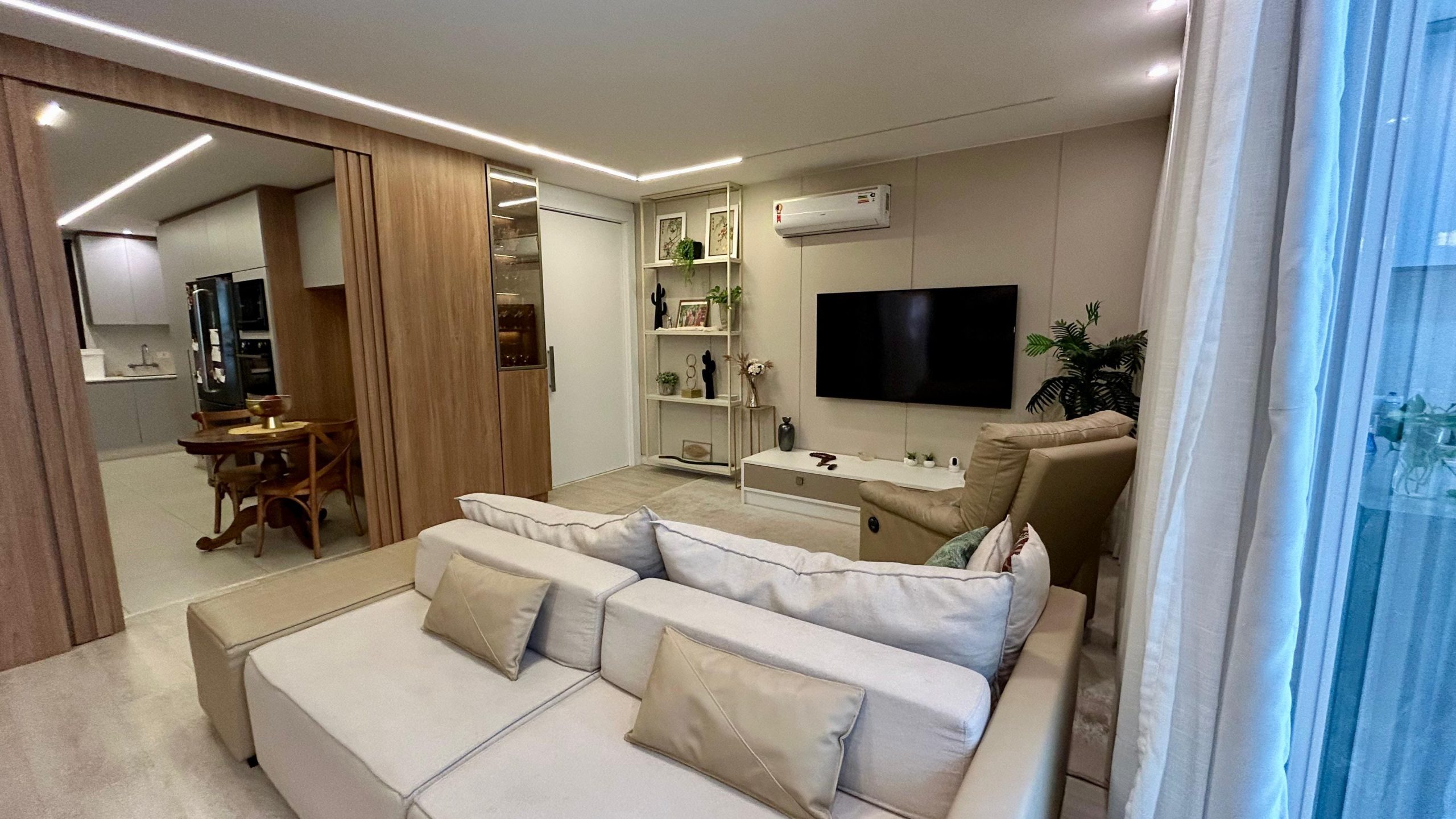 A sala de estar integrada à varanda gourmet com churrasqueira é ideal para receber amigos e familiares, enquanto a cozinha planejada une funcionalidade e estilo.